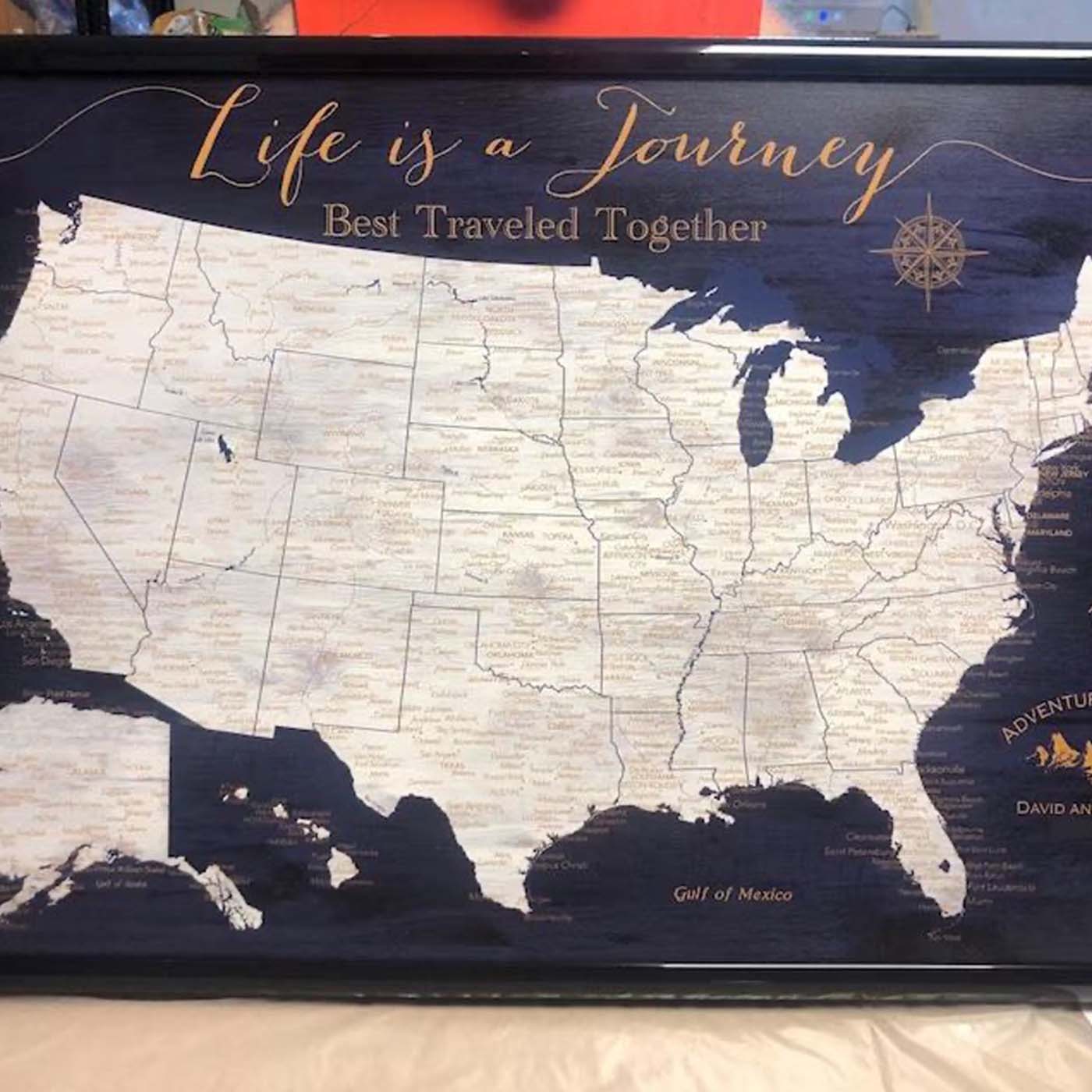 Absolutely beautiful! Well packaged so it could arrive safely. The frame we received was better quality than imagined - perfection! I love that this map also has the places labeled so you know exactly where you're putting the pins. Overall - I would highly recommend to a friend!