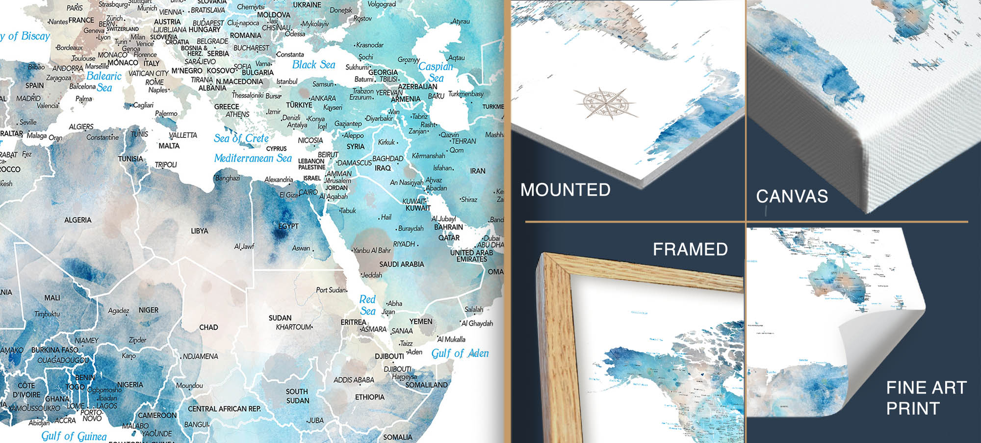 The blue watercolor style reflects oceans and skies, with crisp map labels that are nicely readable at any of the available sizes.