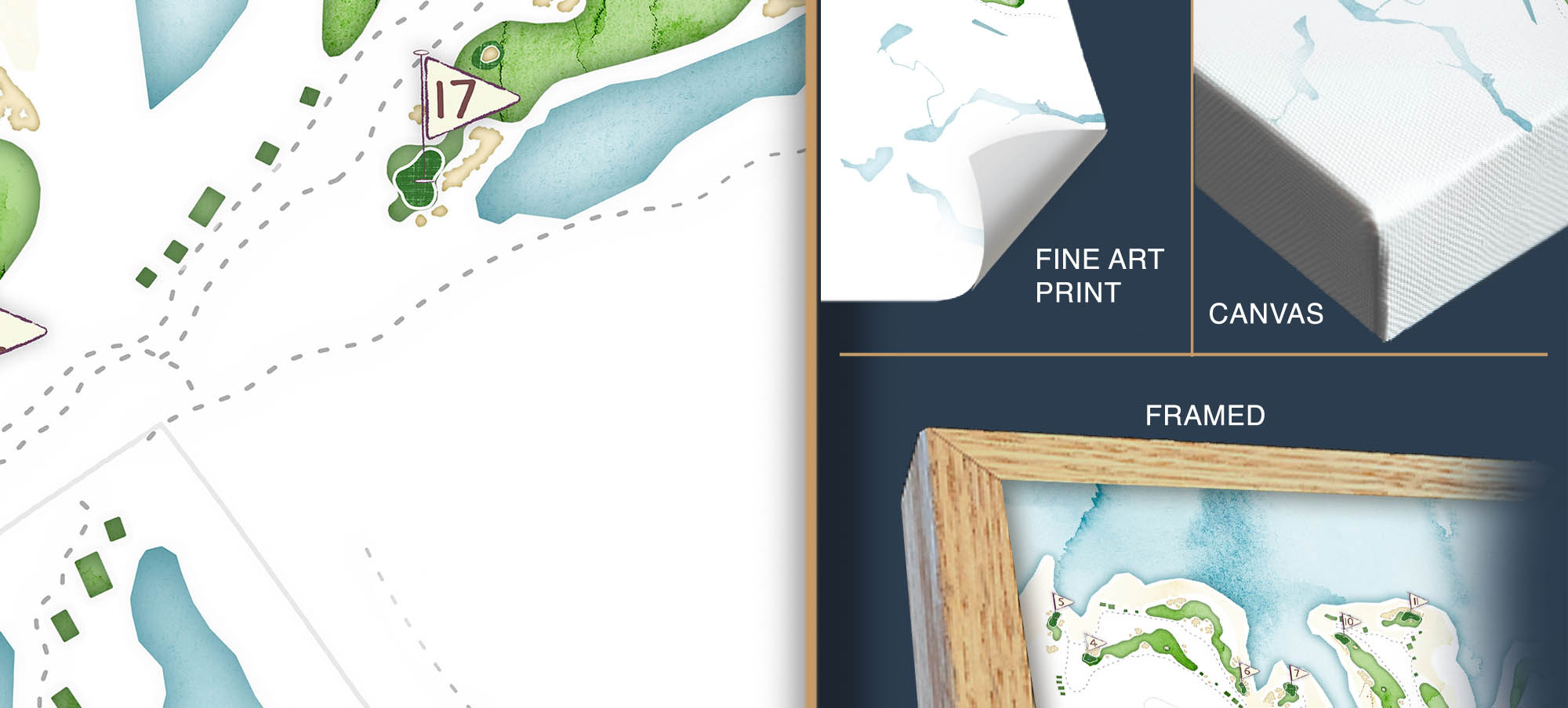 Our individual golf maps are made as lasting keepsakes. Each design is created in the HappyPlaceArt studio and printed using archival materials and pigment inks for long-term color stability. Every format is built to look great on your wall for decades.